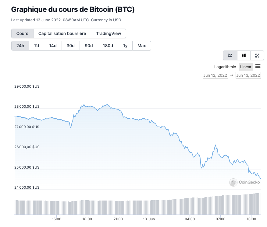 Les estimations de l’inflation pour les États-Unis, 8,6 %, ont été annoncées tard vendredi. Ce record de quatre décennies a accru la volatilité du bitcoin, entraînant le plongeon d’aujourd’hui vers la barre des 25 000 dollars.