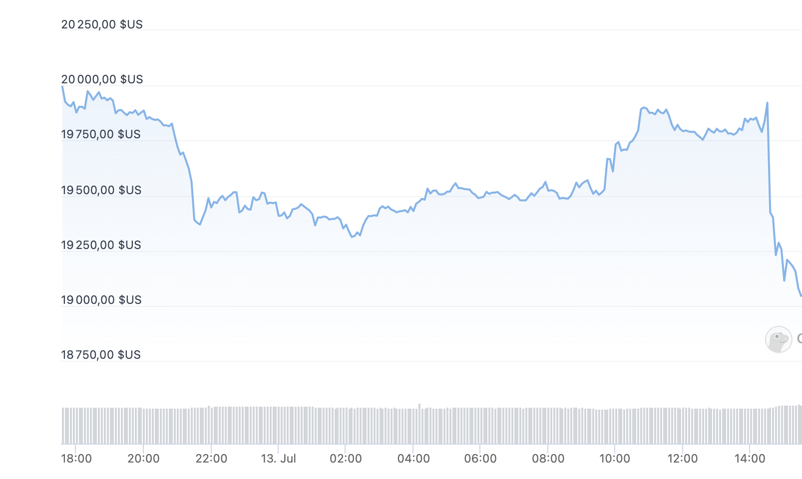 Selon les données de CoinGecko, le prix du bitcoin a chuté de plus de 3 % à 14 h 06 après la nouvelle, la bougie d’une heure ayant atteint son point le plus bas à 19 255 dollars. L’Ethereum n’est pas non plus en reste puisque sa valeur a chuté d’environ 4% à 14h06, atteignant un plancher à 1033$.