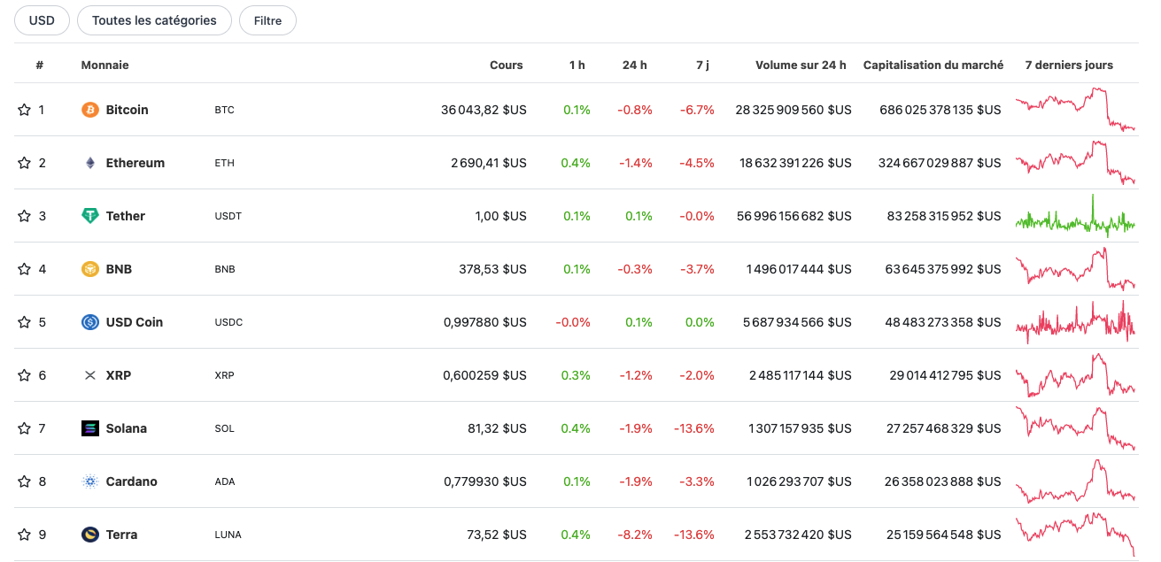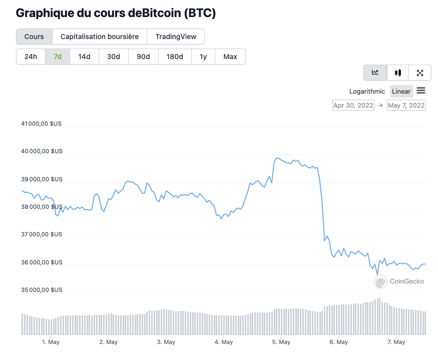 Selon les données de coingecko, le prix du BTC a chuté de 8,5 % au cours de la dernière journée pour s’établir juste en dessous de 36 000 dollars. L’Ethereum (ETH) a connu une performance similaire, avec une baisse de 7 % au cours des dernières 24 heures qui a laissé l’actif se négocier au-dessus de 2700 $.
