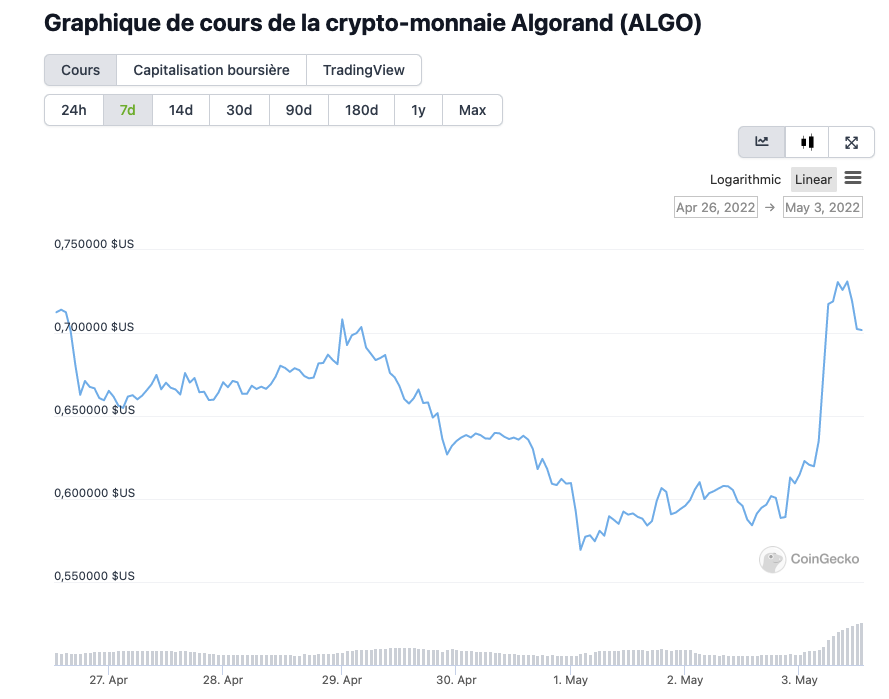 Le prix du jeton ALGO a bondi de plus de 20 % au cours des dernières 24 heures, selon les données de coingecko.