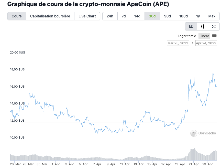 L’APE se négocie actuellement à 16,5 dollars, soit une hausse de plus de 17 % au cours des dernières 24 heures. Son volume de transactions sur 24 heures est de 1,9 milliard de dollars, avec une capitalisation boursière de 4,7 milliards de dollars. Il est intéressant de noter que la capitalisation boursière entièrement diluée d’APE est de 16,5 milliards de dollars !