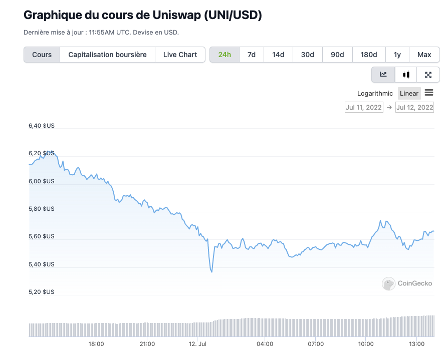 Le jeton natif d’Uniswap, UNI, a chuté de 9% au cours des dernières 24 heures.