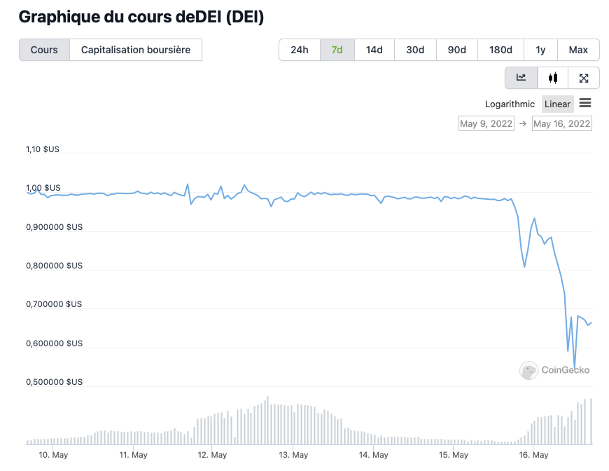 Le stablecoin DEI se négocie actuellement à 0,66 $ après avoir récupéré son plus bas niveau historique de 0,55 $ enregistré le 16 mai. Bien que DEI ressemble en de nombreux points à l’UST de Terra, le stablecoin de DEUS Finance est garanti (contrairement à l’UST).