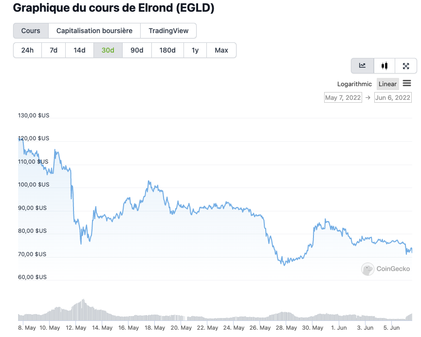 EGLD reste en baisse, passant d’environ 75 dollars à 21h00 UTC à 72,30 dollars.