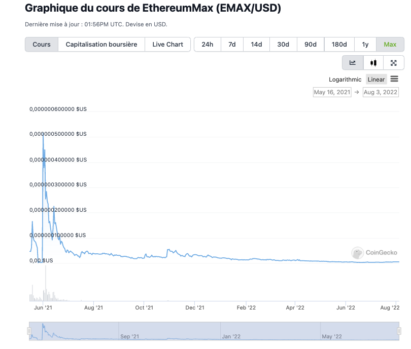 EthereumMax – ou EMAX – est un jeton dont personne ne savait vraiment rien jusqu’à ce que des célébrités en fassent la promotion. (Floyd Mayweather en a fait la promotion sur un T-shirt lors d’une conférence sur le bitcoin à Miami en juin 2021). Il fonctionne sur Ethereum, qui héberge des milliers d’altcoins, mais il ne semble pas avoir d’utilité. En ce moment, il se négocie à un prix de 0,000000004702 $, selon Coingecko.