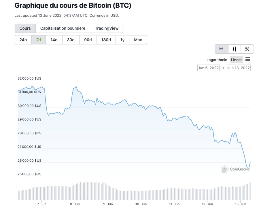 Le bitcoin a perdu 18 % au cours des sept derniers jours et est passé sous la barre des 26 000 $ pour atteindre 25 513 $, son point le plus bas de 2022 et un plus bas sur 12 mois. L’Ethereum a connu une situation encore pire, avec une baisse de 28 % au cours de la semaine dernière, même après un essai de fusion en grande partie réussi mercredi sur le réseau de test Ropsten. (Vendredi, les développeurs du noyau d’Ethereum ont fait part de leur décision de retarder de deux mois la « bombe de difficulté« , une étape cruciale de la fusion, ce qui n’a peut-être pas aidé le sentiment autour d’ETH).