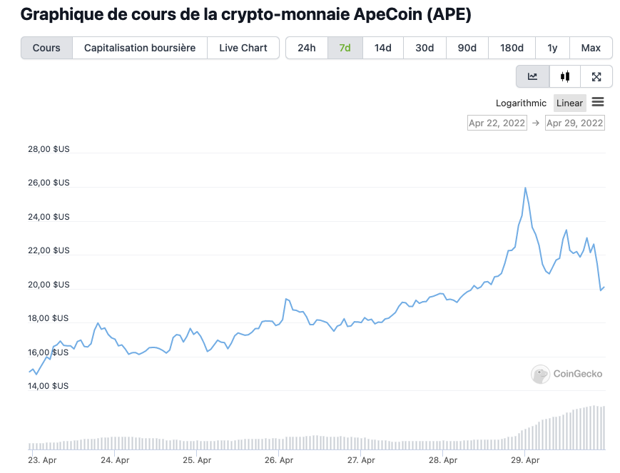 Depuis le lancement de l’ApeCoin le 17 mars, le jeton a connu de fortes fluctuations de prix. Peu après son lancement, il a atteint son plus bas niveau à 6,21 $, mais a rebondi fortement. Depuis le 21 avril, l’ApeCoin a atteint une série de nouveaux sommets historiques et se négocie actuellement à 20,40 $.