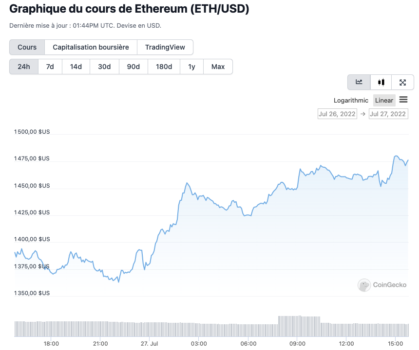 Mardi, l’ethereum a glissé sous les 1 400 $, mais les prix ont maintenant rebondi pendant la session du jour. l’Ethereum, qui a touché un plus bas à 1 362,95 $ mardi, s’échange maintenant à un sommet de 1 470,74 $.