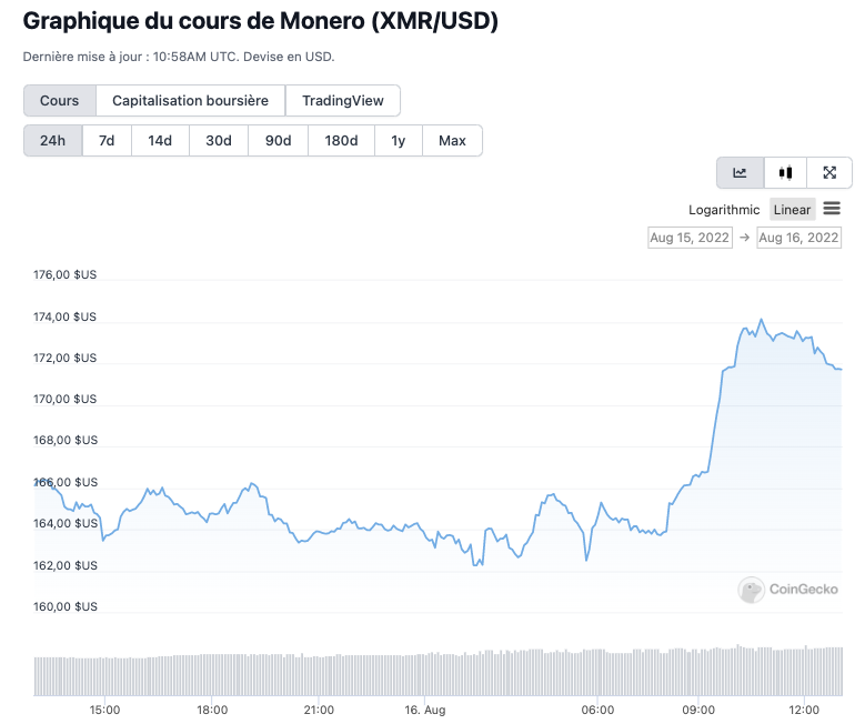 La nouvelle de la réussite de la mise à niveau du réseau semble avoir booste le prix de Monero, qui est actuellement en hausse d’environ 3 % sur la journée, la monnaie privée changeant actuellement de mains à environ 172 $.