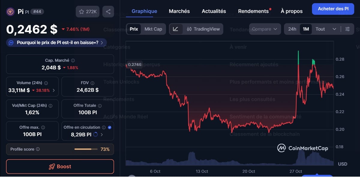 Le token $PI, cœur économique du réseau, a connu une volatilité excitante. Il affiche une hausse de plus de 30 % sur la semaine. Son prix oscille autour de 0,247 dollar (USD). Il faut bien reconnaître que le volume d’échange quotidien, d’environ 51,77 millions de dollars, montre un intérêt soutenu. Les analystes techniques identifient une résistance clé à 0,28 dollar.