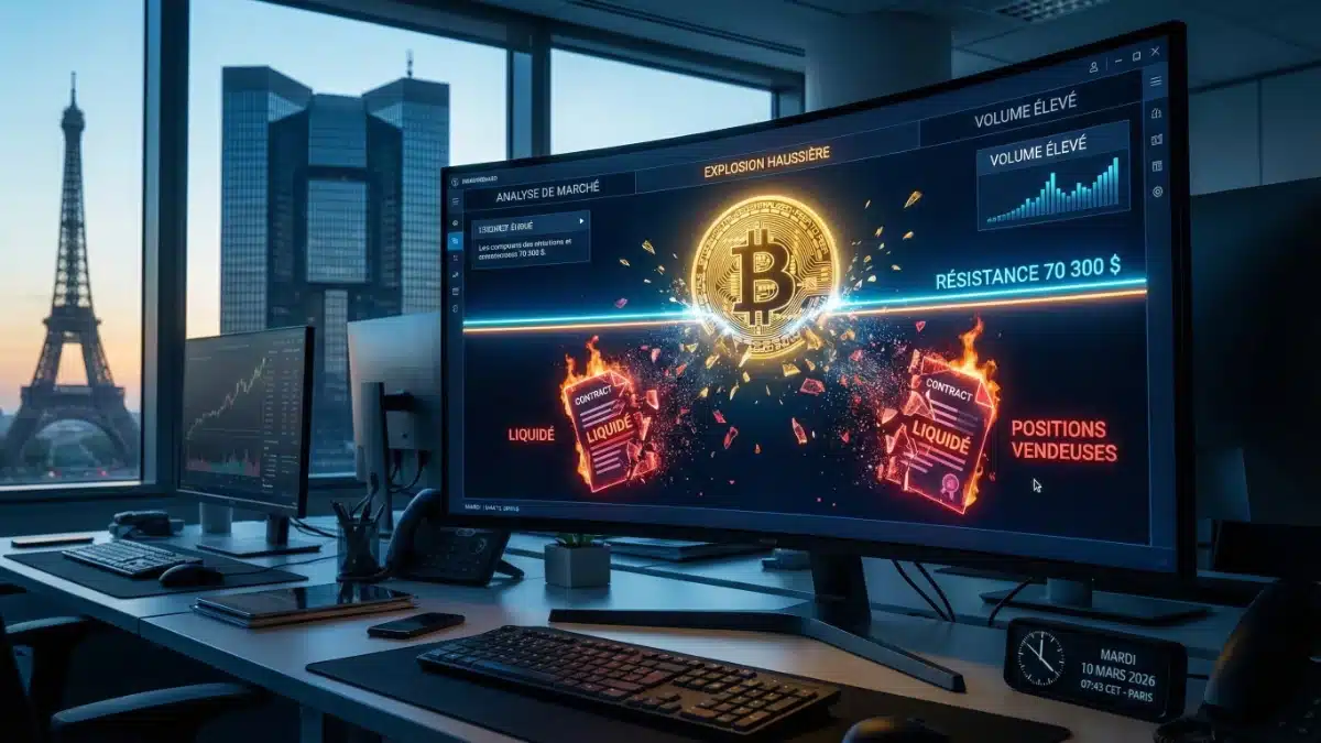 Le marché des cryptomonnaies entre en pleine ébullition ce mardi 10 mars 2026. Le cours Bitcoin lance un assaut d’une violence inouïe sur la résistance psychologique majeure des 70 000 dollars. Cette accélération nocturne laisse derrière elle un véritable champ de bataille sur les marchés dérivés. Entre des liquidations en cascade et des rumeurs de ventes institutionnelles, décryptage d’un Bitcoin qui accumule une énergie explosive.