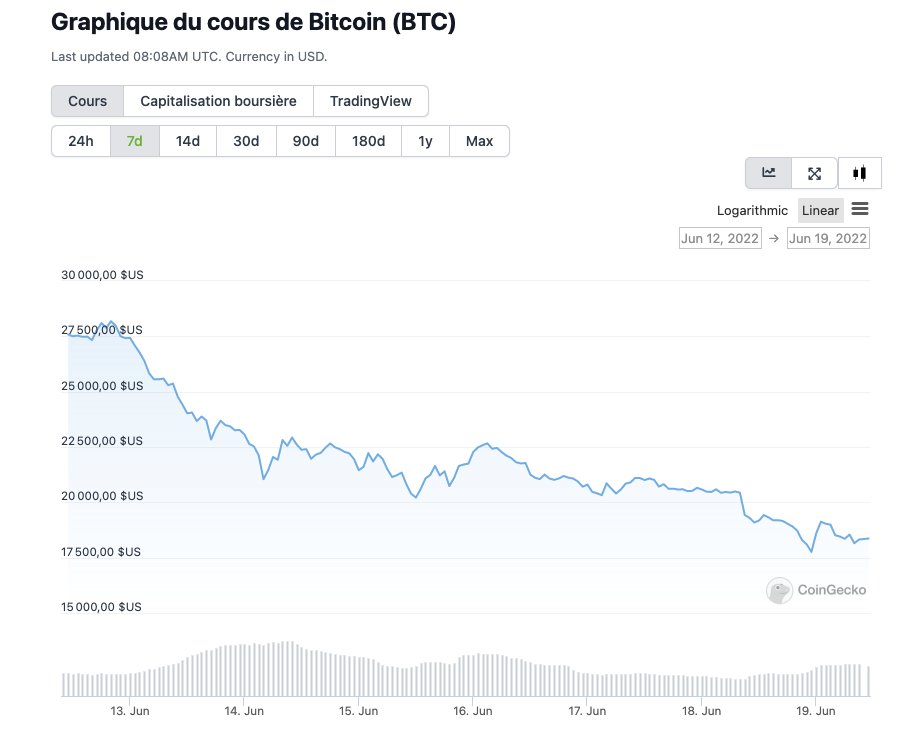 Le bitcoin s’échange à environ 18 319 $, soit une baisse de 10,8 % au cours des dernières 24 heures. La capitalisation boursière du bitcoin s’est effondrée à environ 350 milliards de dollars, soit une baisse de 73 % par rapport à son record historique de novembre, selon CoinGecko.