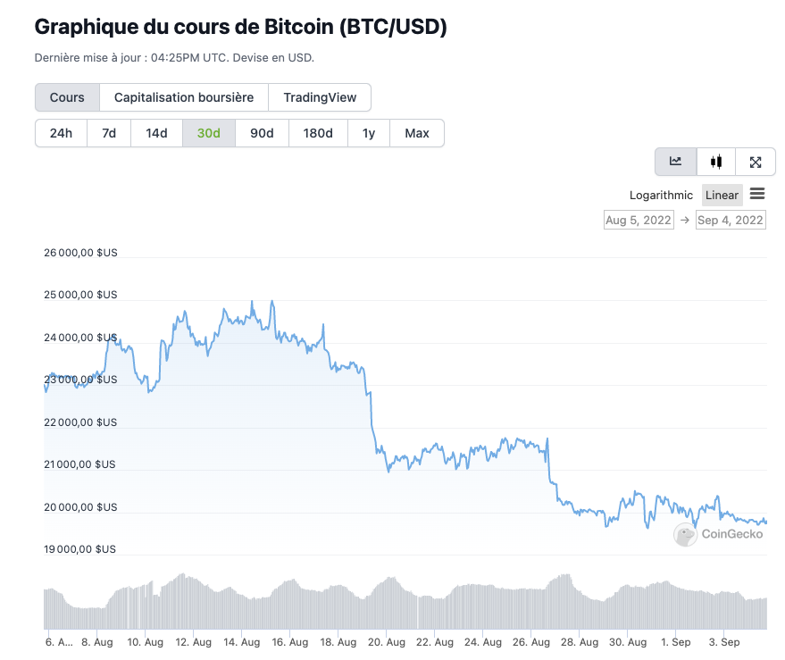 À l’heure où nous écrivons ces lignes, le BTC se situe à 19 782 dollars, en baisse de 0,94 % au cours des dernières 24 heures, selon Coingecko. Ce chiffre est radicalement bas si on le compare au récent sommet de 24 887 $ atteint à la mi-août.