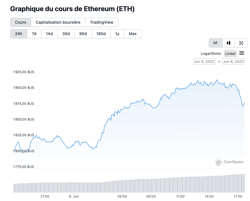 Le prix de l’Ethereum vient quant à lui d’atteindre un sommet intrajournalier de 1 889 dollars, alors qu’il a augmenté de près de 6 %, selon coingecko.