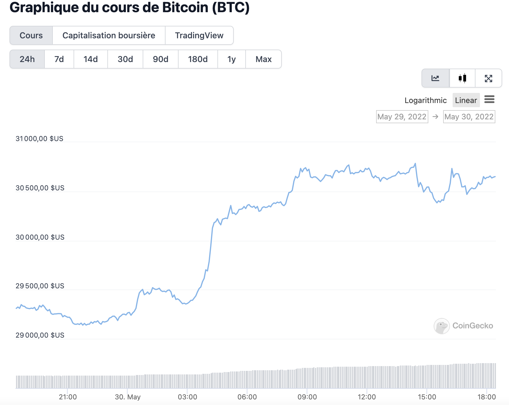 Le bitcoin a gagné 5,6 % au cours des dernières 24 heures pour dépasser les 30 000 dollars, dans une brève démonstration de force au milieu d’une série de pertes record, selon les données de coingecko.