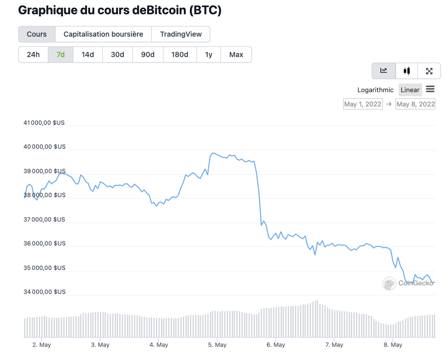 Le BTC a enregistré l’une de ses plus fortes baisses en 2022 cette semaine, les investisseurs craignant un assèchement des liquidités dû à la hausse des taux d’intérêt et au ralentissement de la croissance économique. Le jeton a perdu 7,4 % au cours des sept derniers jours et se négocie près des plus bas de 2022, à 35 000 $.