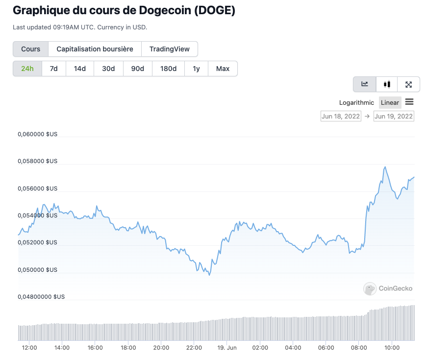 Le prix du dogecoin a grimpé de près de 13 % sur la bourse Binance en raison des tweets de Musk. Le DOGE a atteint un sommet intrajournalier de 0,05877 $.