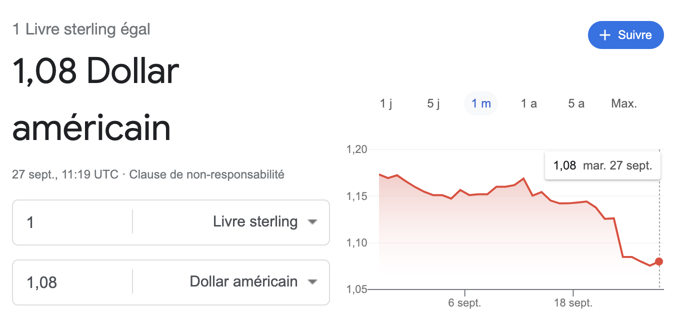 La livre sterling a reculé de près de 5 % lundi pour tomber en dessous de son plus bas niveau de 1985. Elle a atteint 1,0327 $ avant de se redresser à 1,0605 $. Vendredi 23, la livre avait chuté de plus de 3,5 % par rapport au dollar après que le nouveau gouvernement eut annoncé les plus importantes réductions d’impôts depuis 50 ans.