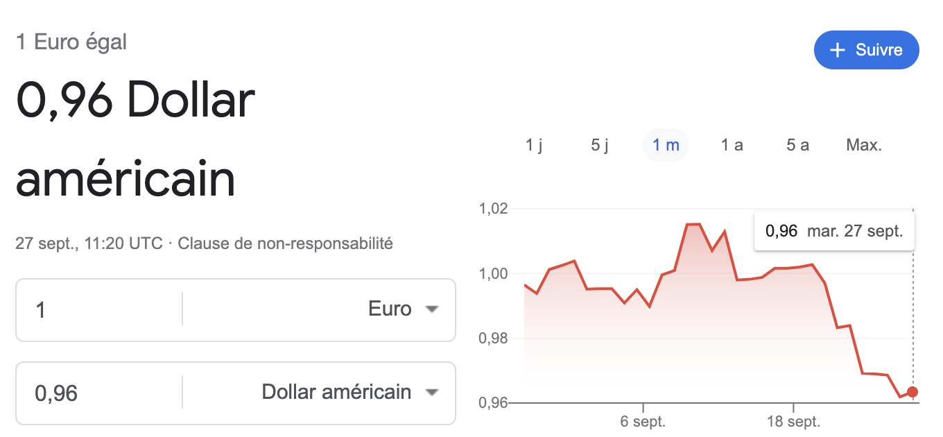 L’euro a également atteint son plus bas niveau en 20 ans lundi. Il s’échangeait à USD 0,9551 à l’ouverture des marchés et a ensuite rebondi à USD 0,9674. Lundi 8 août, l’euro était tombé sous le dollar américain. Selon la banque allemande Commerzbank, la faiblesse de l’euro par rapport au dollar pourrait durer jusqu’au début de 2023.