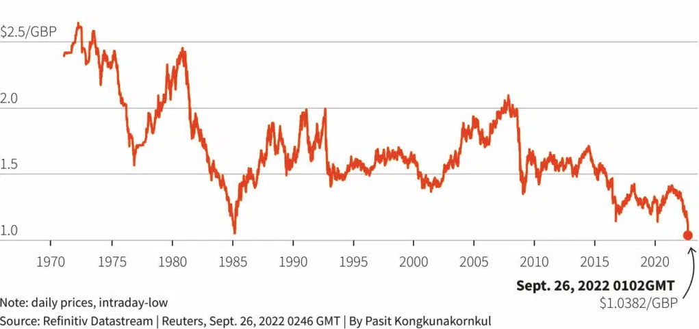 Le graphique ci-dessus montre l’équivalence de la livre sterling en dollars américains du début des années 1970 à aujourd’hui. Comme on peut le voir, au début de cette décennie, la livre équivalait à plus de 2,5 dollars, elle a atteint un plancher de 1,08 dollar en 1985, et a atteint un nouveau plancher historique lundi.
