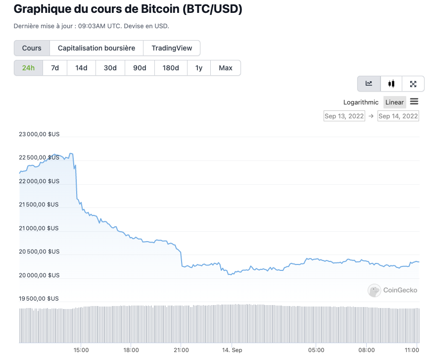 Dans un contexte où le rapport sur l’inflation est plus mauvais que prévu, les quatre principaux indices de Wall Street (NYSE, Nasdaq, Dow Jones, S&P 500) ont fortement chuté après le rapport du Bureau of Labor Statistics publié mardi. Tous les cinq métaux précieux (or, argent, palladium, platine, rhodium) ont enregistré des pertes par rapport au dollar au cours des dernières 24 heures, l’or ayant perdu 1,47 %. Après avoir enregistré quelques gains la veille, la crypto économie a perdu 5,8 % par rapport au dollar mardi également. Au cours de la dernière journée, le bitcoin a perdu 6 % de sa valeur, tandis que l’ethereum est en baisse de 8%.