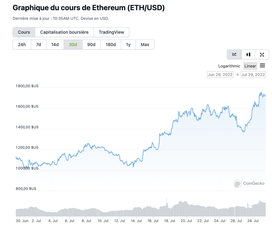 L’Ethereum dépasse les 1700 $ avoir gagné 15 % jeudi, alors que le réseau se prépare à « the merge »