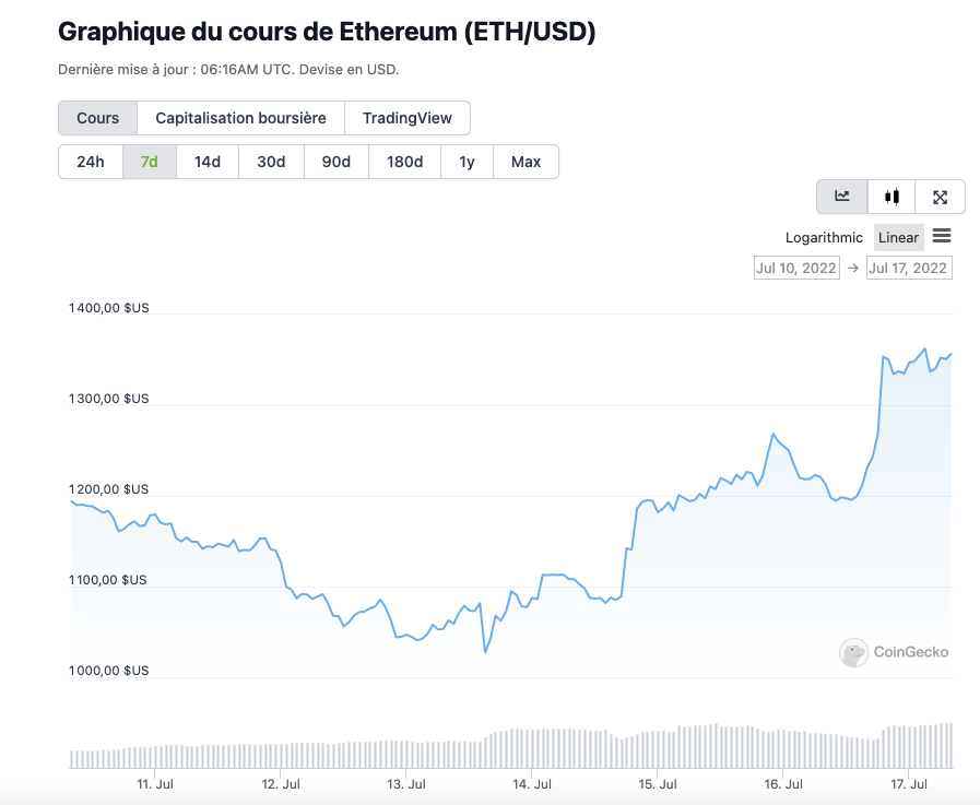 Le numéro deux des crypto-monnaies a enregistré une hausse de 12 % samedi, touchant brièvement les 1 363 dollars pour la première fois depuis un mois. Depuis, il s’est légèrement calmé et se négocie actuellement à environ 1 355 $.