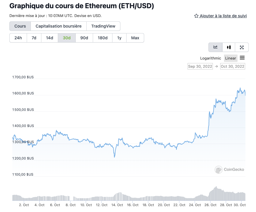 Selon Santiment, la domination du prix de l’Ethereum a augmenté par rapport au Bitcoin et aux autres principaux actifs numériques en octobre. Le prix de l’Ethereum a réussi à augmenter d’environ 24% au cours des 30 derniers jours, tandis que les autres cryptomonnaies ont du mal à suivre. Le prix du bitcoin a enregistré une reprise de 7 % au cours de la même période.