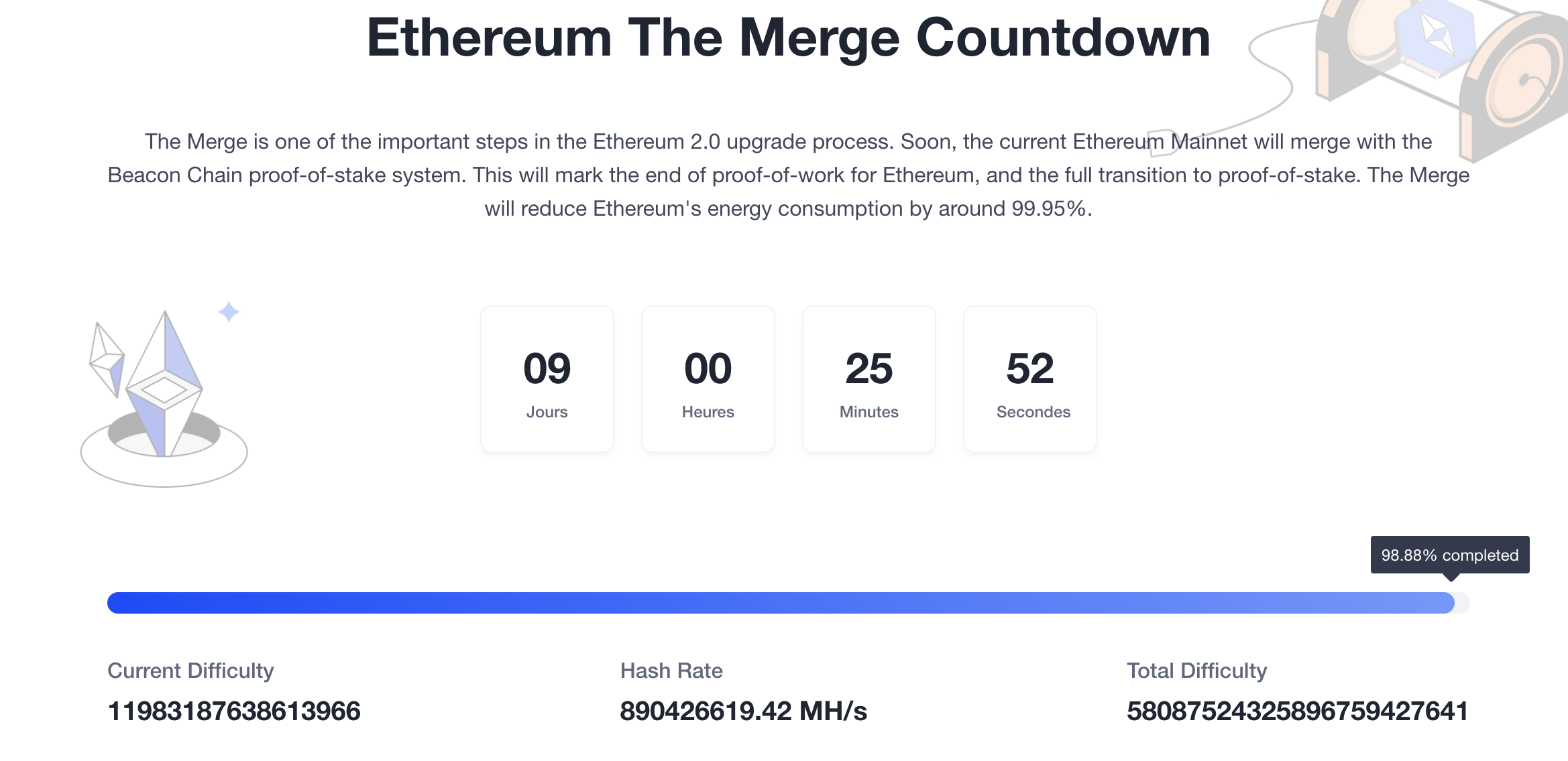 Selon le compte à rebours Ethereum The Merge d’OKLink, le degré de préparation à la fusion a atteint presque 99 %. De plus, le taux de hachage du réseau est de 892,23 TH/s, toujours au-dessus du niveau nécessaire de 872 TH/s, ce qui est suffisant pour déclencher la fusion d’Ethereum Mainnet et de Beacon Chain à la difficulté totale terminale (TTD) de 58750000000000000000000.