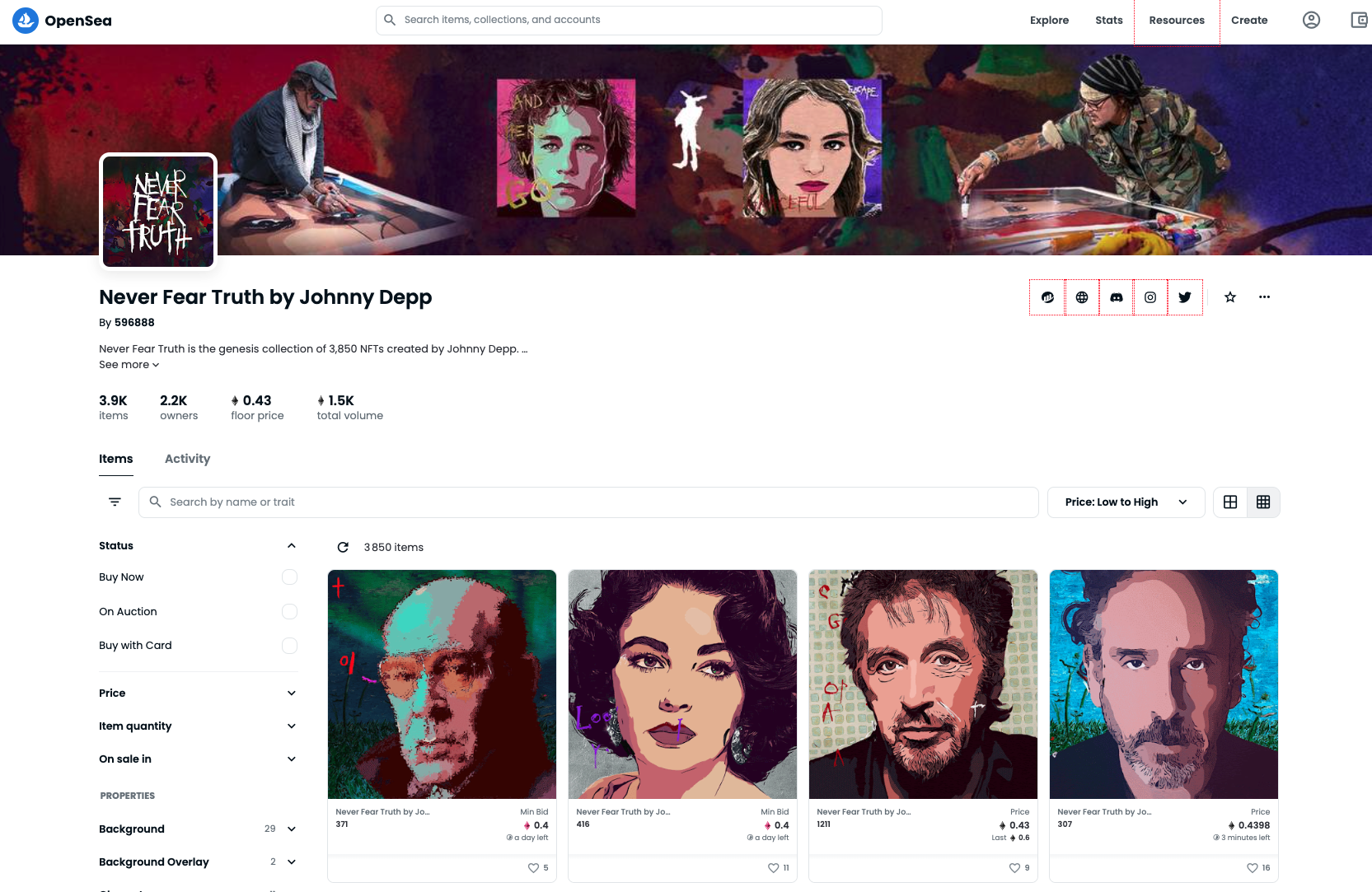 La collection d’art génératif « Never Fear Truth » sur OpenSea est frappée sur Ethereum, avec des œuvres de Depp. Le projet a été vérifié comme authentique par MakersPlace le mois dernier. La collection comprend des images des « amis et héros » du passé de Depp, notamment Heath Ledger, Tim Burton, River Phoenix, Elizabeth Taylor, Al Pacino et Hunter S. Thompson.