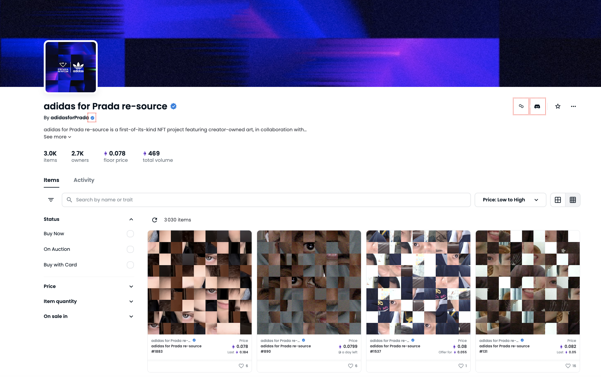 La marque s’était déjà associée à la marque de vêtements de sport adidas pour lancer la collection « adidas for Prada re-source« , qui est sortie en janvier sur Polygon (cette collection n’a vu que 468 ETH en volume total échangé, et son prix plancher est seulement de 0,077 ETH, ou 140 $, par NFT).