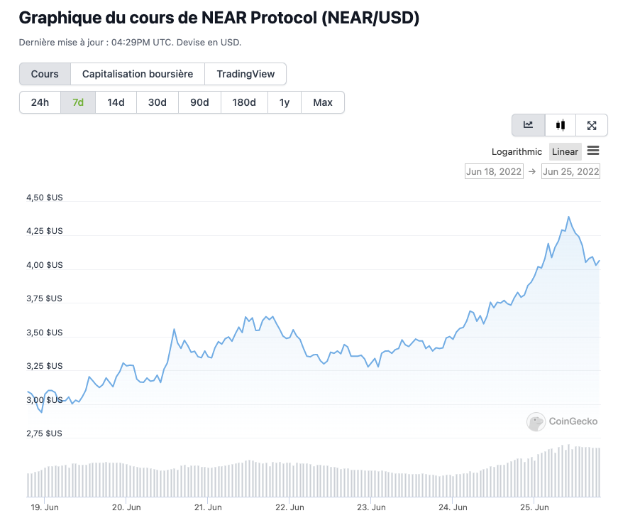 Le mouvement voit NEAR grimper à son point le plus élevé depuis plus de deux semaines, avec des traders probablement fixés sur la prise de prix au-dessus de 5 $.