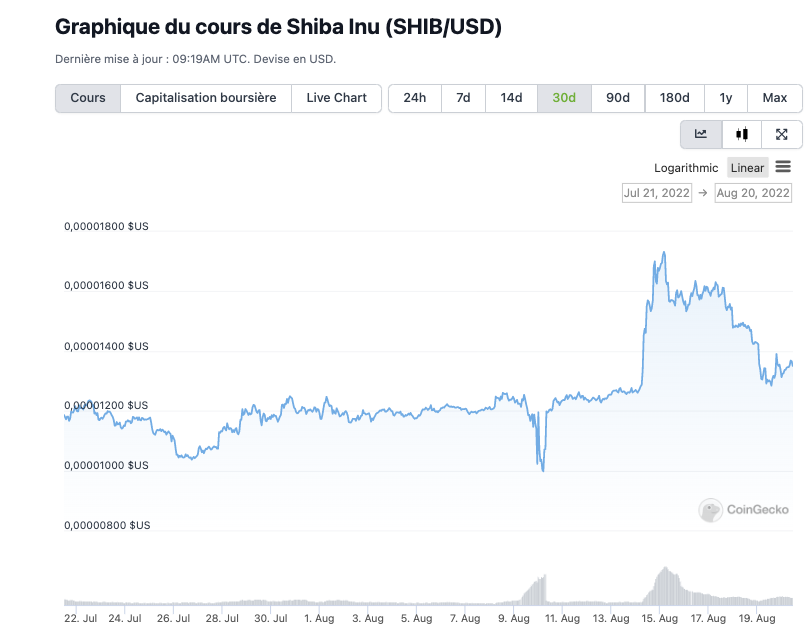 La hausse du prix de SHIB fait suite à un pic du taux de combustion du jeton en début de semaine. Les détenteurs ont brûlé un peu moins de 15 000 000 de SHIB le 17 août, puis plus de 180 000 000 le 18 août, selon le Shib Burn Tracker, soit un bond de plus de 1 100 %. Cependant, cette hausse semble avoir été de courte durée ; selon un autre tracker, ShibBurn, le taux de combustion des jetons a reculé de plus de 90 % au cours des dernières 24 heures.