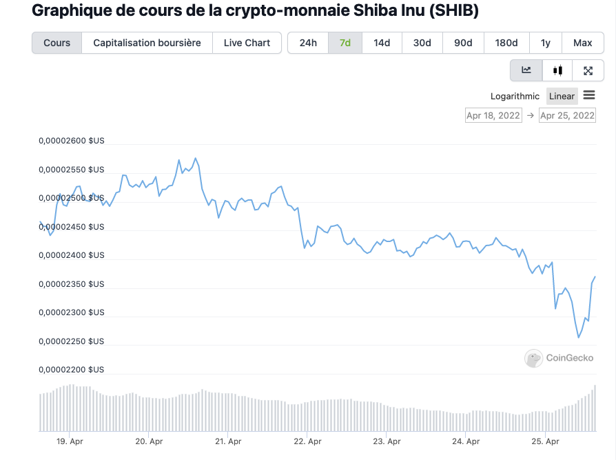 SHIB est en baisse de 2,13% au cours de la dernière journée, se négociant à environ 0,00002364 $ selon coingecko.
