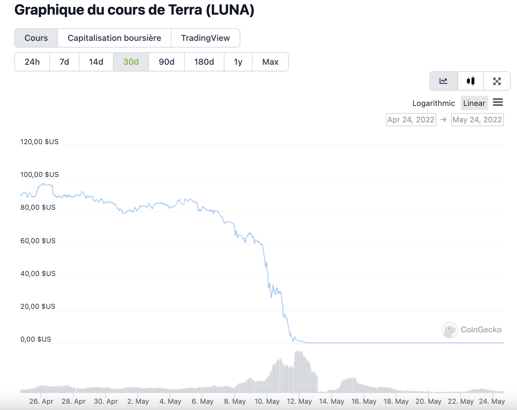 Ces derniers jours, le graphique des deux mesures ressemble à un manège, le prix et la capitalisation de LUNA ayant augmenté de près de 100 % sur le moment, atteignant des valeurs de 0,0002 $ et 1,4 milliard de dollars, respectivement. Mais au 24 mai, le prix par jeton est de 0,000165 $ et la capitalisation boursière du projet oscille autour de 1 milliard de dollars.
