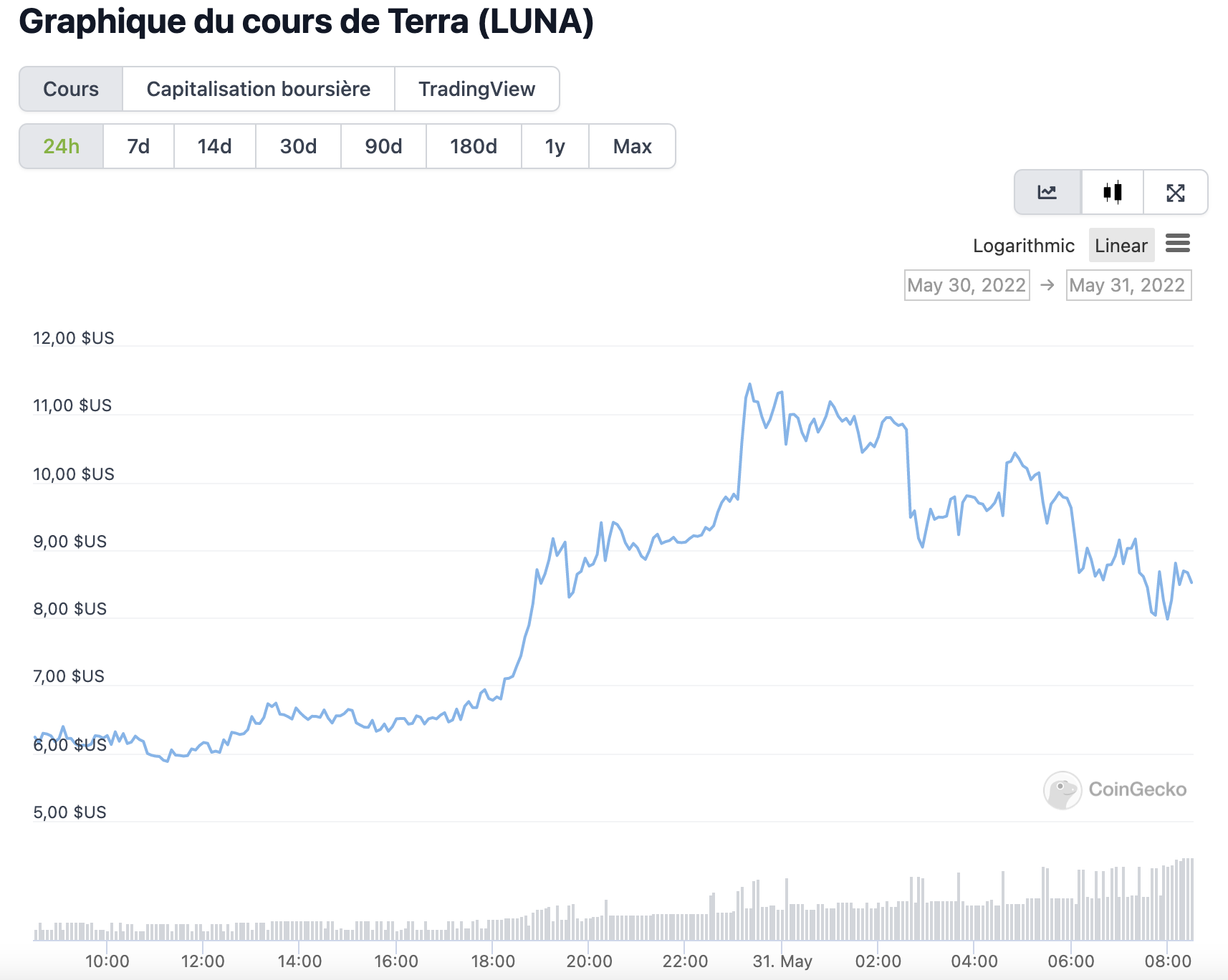 Une raison potentielle de la récente hausse du prix de LUNA est la prochaine cotation sur Binance prévue pour le 31 mai. Selon une annonce publiée le 28 mai, Binance inscrira Terra 2.0 (LUNA) dans sa zone d’innovation et ouvrira la négociation pour les paires de négociation LUNA/USDT et LUNA/BUSD.
