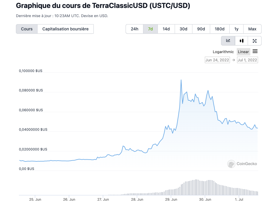 Cependant, depuis le creux de 0,006 $ par unité, UST a bondi de 617,5 % par rapport à cette fourchette. UST a gonflé de 472,4 % cette semaine pour atteindre 0,0926 $ le 29 juin. Bien que la valeur d’UST ait chuté après cette hausse, elle est restée dans une fourchette de négociation de 24 heures allant de 0,04217516 $ à 0,081822 $ le jeudi 30 juin selon les données de Coingecko.